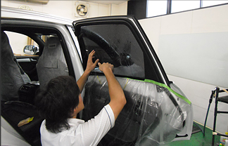 リヤガラスに施工を行っているところです。高温の工業用ドライヤーで成形したフィルムをロール状に巻いて、ホコリが入らないように細心の注意を払いながら施工します。