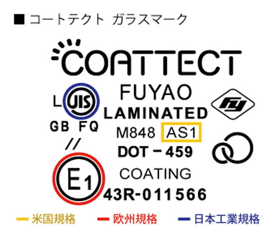 また、日本工業規格(JIS)はもちろん、欧州規格(Eマーク)、米国規格(ASマーク)といった世界の自動車ガラス規格に合格しています。