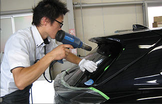 リヤガラスに施工を行っているところです。高温の工業用ドライヤーで成形したフィルムをロール状に巻いて、ホコリが入らないように細心の注意を払いながら施工します。